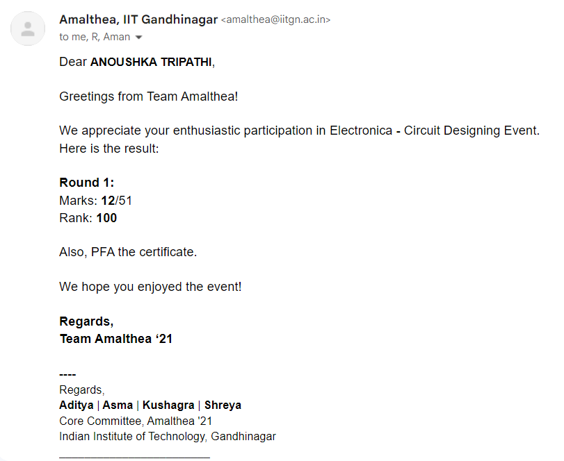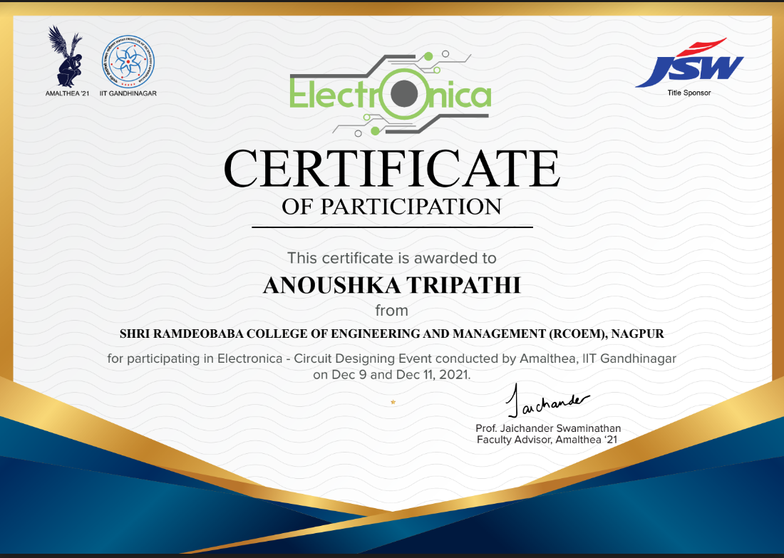 A challenging National level Quiz competition organized by IIT Gandhinagar on Digital and Analog Electronics + Electrical Engineering in which I appeared in my class 12th Std. secured 100th rank out of 300 students. Looking forward to participate once